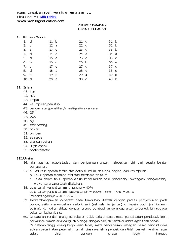 Untuk membantu pemahan materi dan latihan soal tematik. Soal pts kelas 4 semester 2 tema 6 ini belum dilengkapi beserta kunci jawaban tema 6 kelas 4 semester 2. Soal dan kunci jawaban tema 2 kelas 6 halaman 4 subtema 1 pembelajaran 1. Soal tematik kelas vi tema 1 subtema 1. Berilah tanda silang (x) pada huruf a, b, c atau d pada jawaban yang benar!